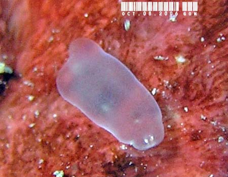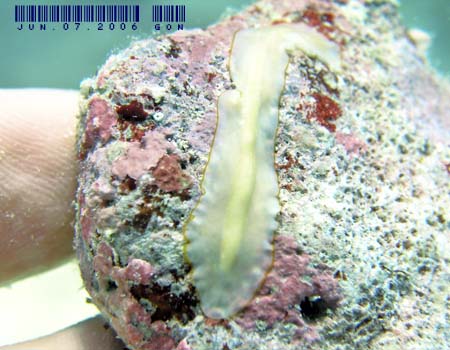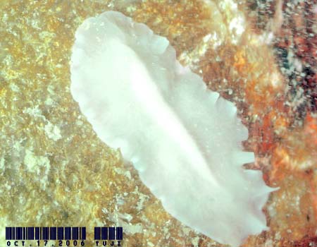 | 和名(Japanese) : ? 学名(Name) : ???? ポイント(Point) : ラウラウビーチ (Laulau Beach) 深度(Depth) : 9m 体長(Length) : 4mm 撮影日(Date) : 10/08/2006 撮影者(Photo/Copyright) : GON コメント(Comment) : サンゴ礫裏にて。滑る様に移動する。 |