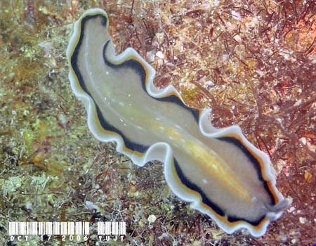 | 和名(Japanese) : 学名(Name) : ポイント(Point) : アマモ場 (Eelgrass Beds, Garapan) 深度(Depth) : 1.5m 体長(Length) : 20mm 撮影日(Date) : 10/27/2006 撮影者(Photo/Copyright) : Yuji コメント(Comment) : ヒロハサボテングサにくっ付いて休息中だった模様。 10月にサクラニセツノヒラムシとして掲載しましたが、千葉県立中央博物館の海の博物館 研究員・奥野さんより、別種だろうとのご指摘を頂きましたので変更します。 この個体とサクラニセツノヒラムシでは、マージンの帯の色が違いました。また背中線に白い縦縞が入っていません。この種はまだ学名が定まっていない未記載種のようなので、早く名前が決まると良いですね。 奥野さん、ありがとうございます。Nov.2006 |