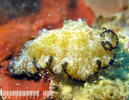 | 和名(Japanese) : ? 学名(Name) : Pseudoceros ? ポイント(Point) : ラウラウビーチ (Laulau Beach) 深度(Depth) : 8m 体長(Length) : 25mm 撮影日(Date) : 02/08/2007 撮影者(Photo/Copyright) : Gon コメント(Comment) : アニマル柄は今年は流行るのでしょうか? ・11/07/2006に撮った個体と同じ種ではないでしょうか。 |