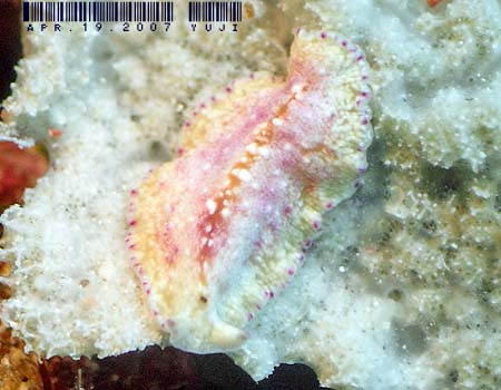 | 和名(Japanese) : ? 学名(Name) : ? ポイント(Point) : ラウラウビーチ (Laulau Beach) 深度(Depth) : 7m 体長(Length) : 5mm 撮影日(Date) : 01/21/2007 撮影者(Photo/Copyright) : Gon コメント(Comment) : キィウィフルーツ美味しいですよねっ。 背中には突起があり、1/02/2006・5/13/2006に撮った個体と同じ種ではないでしょうか。 |