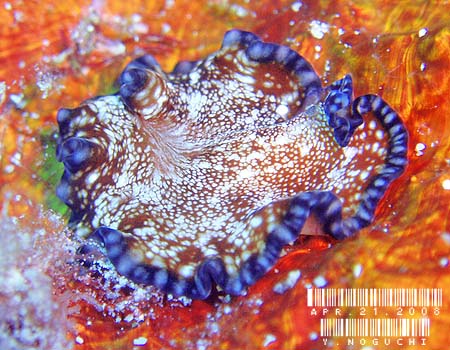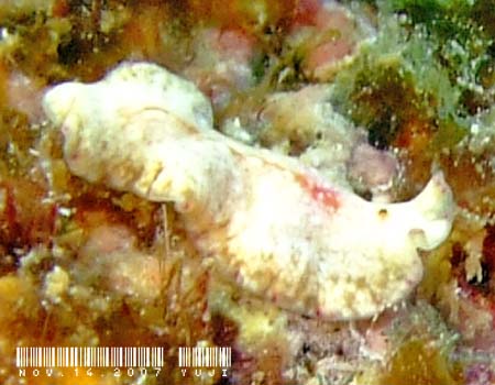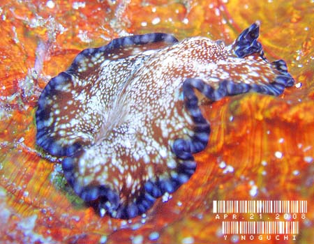 | 和名(Japanese) : フリコケロス・フリティルス かな? 学名(Name) : Phrikoceros fritillus ? ポイント(Point) : オブジャンビーチ (Obyan Beach) 深度(Depth) : *m 体長(Length) : *mm 撮影日(Date) : 06/30/2007 撮影者(Photo/Copyright) : Ms.Y.Saga コメント(Comment) : 産卵中なのか、はたまた誰かの卵を食べているのか不明。ウミウシの卵隗にも似てますよね。 プセウドケロス科(PSEUDOCEROTIDAE)? |