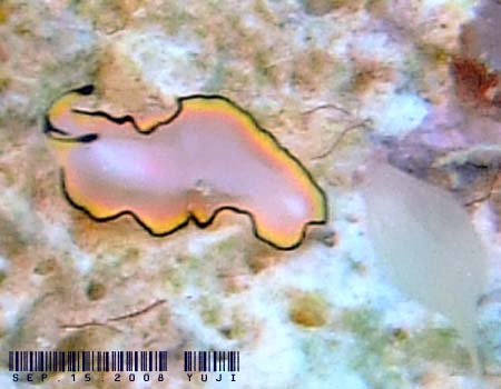 | 和名(Japanese) : ? 学名(Name) : Pseudoceros sp. ? ポイント(Point) : オブジャンビーチ (Obyan Beach) 深度(Depth) : 6m 体長(Length) : 4mm 撮影日(Date) : 09/15/2008 撮影者(Photo/Copyright) : Yuji コメント(Comment) : 2/14/2006分と同種ですかね。縁取りの色の順番が違えば別種になるようなので、ヒラムシって凄く難しい。 |