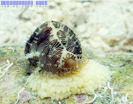 和名(Japanese) : キイロダカラ 学名(Name) : Erosaria moneta (Schilder & Schilder, 1933) 通称(Common name) : Money Cowry ポイント(Point) : アマモ場 (Eelgrass Beds, Garapan) 深度(Depth) : 1.5m 体長(Length) : 20mm 撮影日(Date) : 01/22/2006 撮影者(Photo/Copyright):Yuji コメント(Comment):産卵中! 今まで一緒にしていた、ハナビラダカラとキイロダカラを分けました。Sep.2006 |
