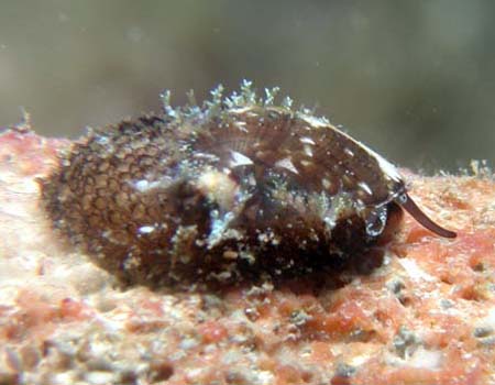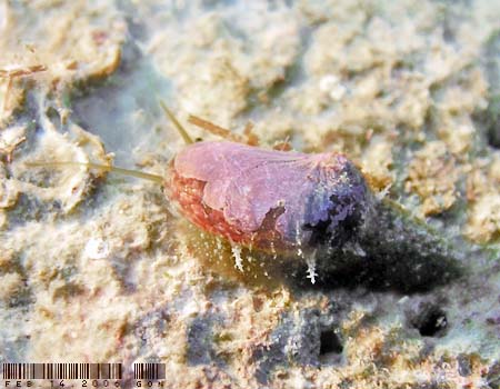 | 和名(Japanese) : スカシガイの仲間 学名(Name) : Keyhole limpet ポイント(Point) : Laulau Beach 深度(Depth) : 7m 体長(Length) : 10mm 撮影日(Date) : 2004 撮影者(Photo/Copyright) : URA コメント(Comment) : ナースMさんが見つけてくれました。初めての出会いで、フナムシかと思った。 |