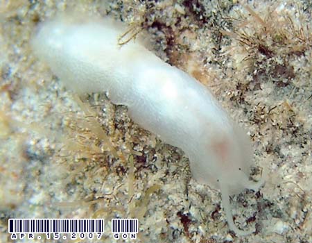 | 和名(Japanese) : チチカケガイ科の1種 学名(Name) : Titiscania limacina (Bergh、1890) ポイント(Point) : ラウラウビーチ (LauLau Beach) 深度(Depth) : 7m 体長(Length) : *mm 撮影日(Date) : 04/15/2007 撮影者(Photo/Copyright) : GON コメント(Comment) : スカシガイの仲間? グアム在住のクレイさんよりアドバイス頂き、ウミウシと同じく貝殻を脱いだ巻貝の仲間・アマオブネガイ目チチカケガイ科"Titiscaniidae"の仲間である事が判明。ちなみにウミウシは海に棲む後鰓類でこちらは前鰓類。両者とも貝殻を脱ぎナメクジ化した生物なのだそうだ。 Dr. Clay-san, Thank you for your advice ! May 2007 |