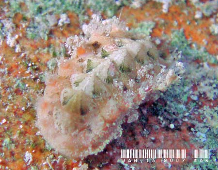 | 和名(Japanese) : ニシキヒザラガイ? 学名(Name) : Onithochiton hirasei ? ポイント(Point) : アマモ場 (Eelgrass Beds) 深度(Depth) : 1.3m 体長(Length) : 5mm 撮影日(Date) : 01/13/2007 撮影者(Photo/Copyright) : Gon コメント(Comment) : なんだこりゃ?動きはウミウシっぽいけど絶対違う風体。一度止まったらぺったり引っ付いてテコでも動かないと決めてるらしい・・。足の裏はウミウシにも似てるけどピーナッツにも見える。 ヒザラガイの仲間で良いと思われるが、確証がないので取り敢えず不明種に投入。Feb.2007 |