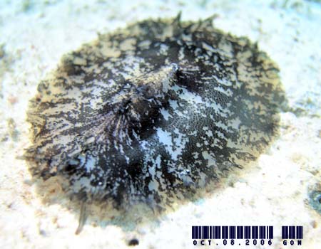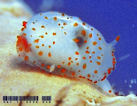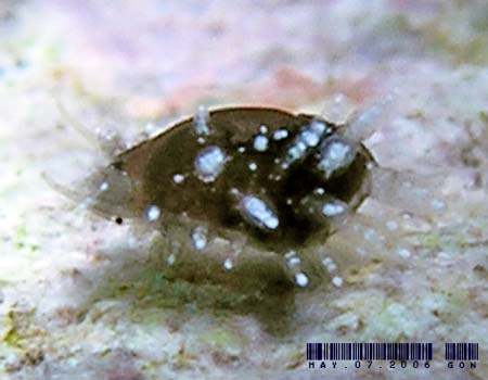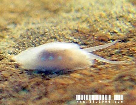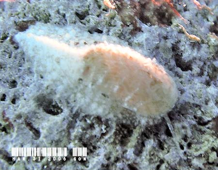 | 和名(Japanese) : ? 学名(Name) : ? ポイント(Point) : Laulau Beach 深度(Depth) : 10m 体長(Length) : 30mm 撮影日(Date) : 10/08/2006 撮影者(Photo/Copyright) : Gon コメント(Comment) : な〜んでしょ?たぶん貝だと思われますが・・。タマゴをグルグル回ってお食事中のチゴミノウミウシ3匹のすぐ横で寝てました。中央の盛り上がりをちょっと失礼して触ってみるとちょっとカタイ・・。もしかしてタマゴのオカン? |