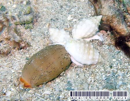 | 和名(Japanese) : ? 学名(Name) : ? ポイント(Point) : ラウラウビーチ (LauLau Beach) 深度(Depth) : 10m 体長(Length) : 10mm 撮影日(Date) : 08/05/2009 撮影者(Photo/Copyright) : Yuji コメント(Comment) : 左側よりエントリーし、広場手前にて。 白い巻貝はアクキガイ科(MURICOIDEA MURICIDAE)の1種でしょうか。それが群れをなして何かに向かっているな、と思いきや、その先にはヤナギシボリダカラ(Isabella Cowry)の1種に群がっている一群が… |